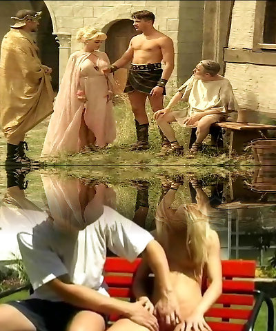 Blonde Slut Gets Spitroasted Outside