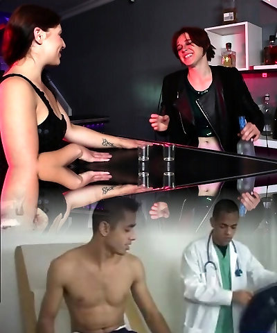 Lesbian lovers grind pussies on bar counter